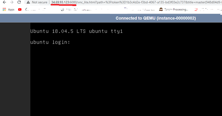 We don't get to see the console. Hovering over the 'Click here to see only the console' - we find that the link is pointing to the internal IP of the compute engine at port 6080.
